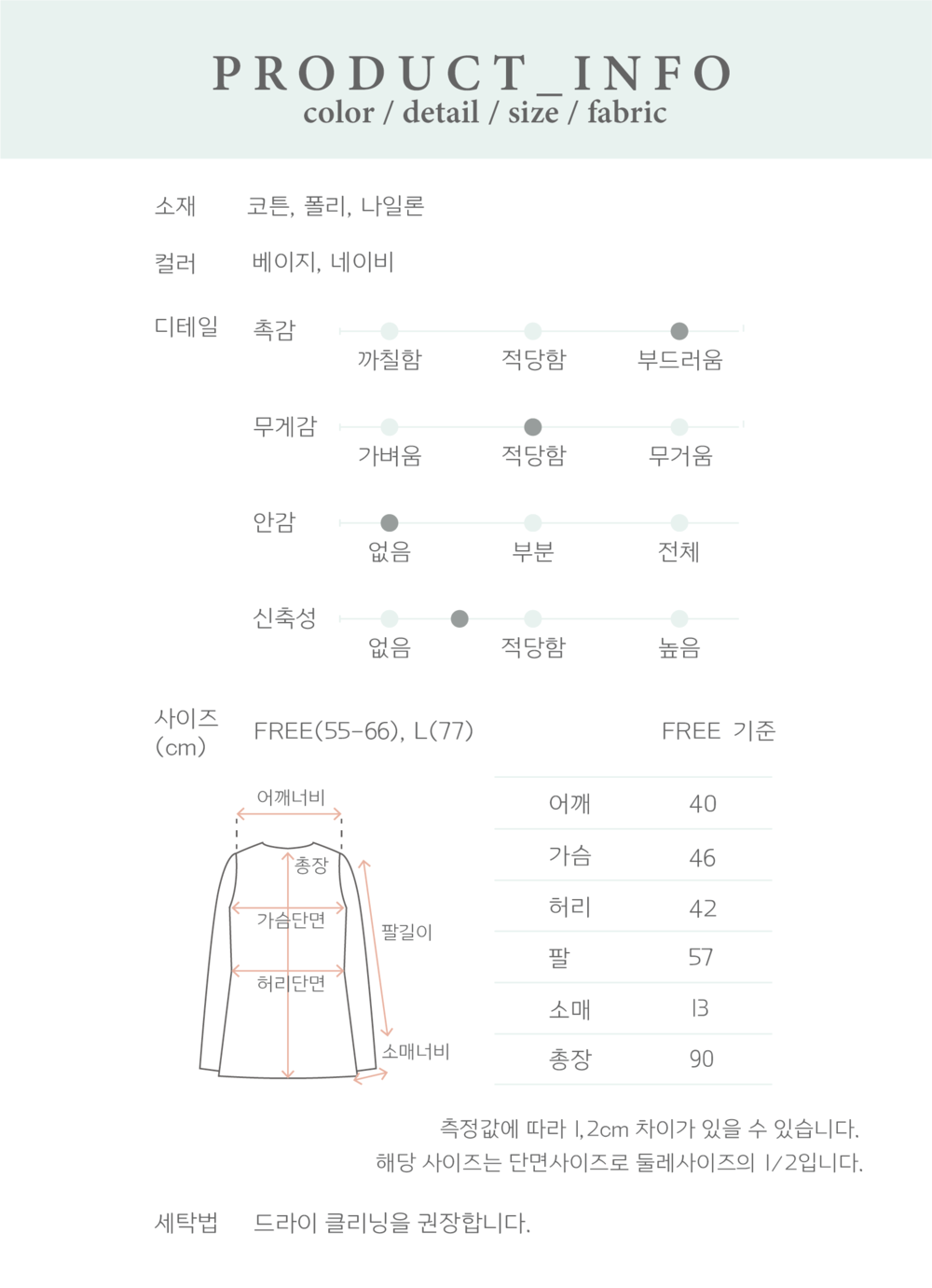 166cm 50kg 전형적 55사이즈 / 착용사이즈 FREE 55-66