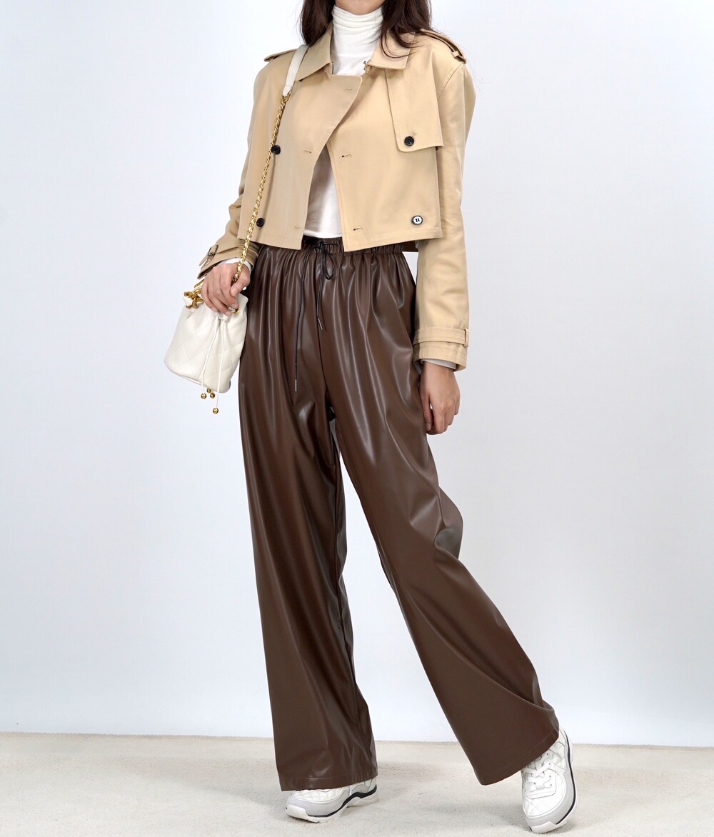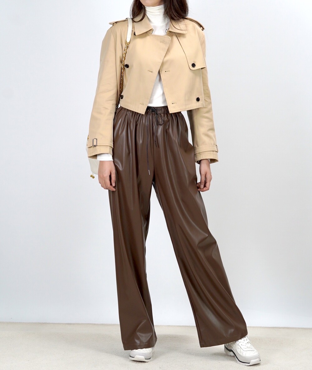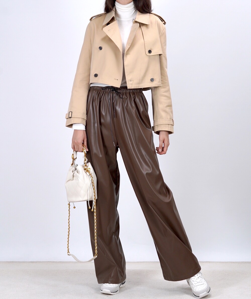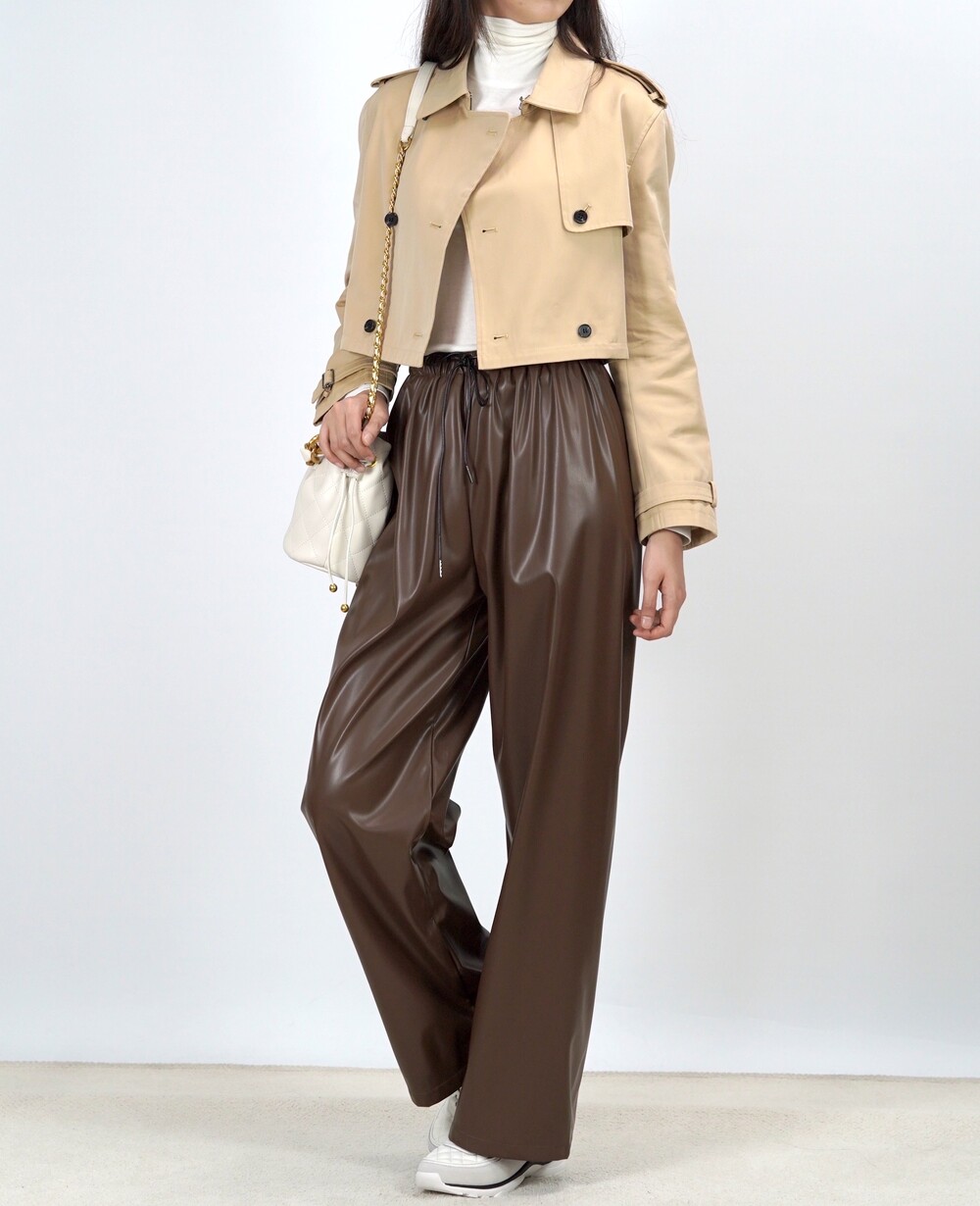 개버딘 원단의 크롭 기장 트렌치 코트로 이루어진 투피스 셋업은
