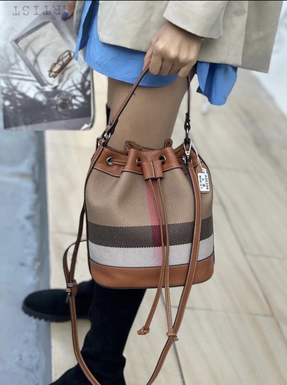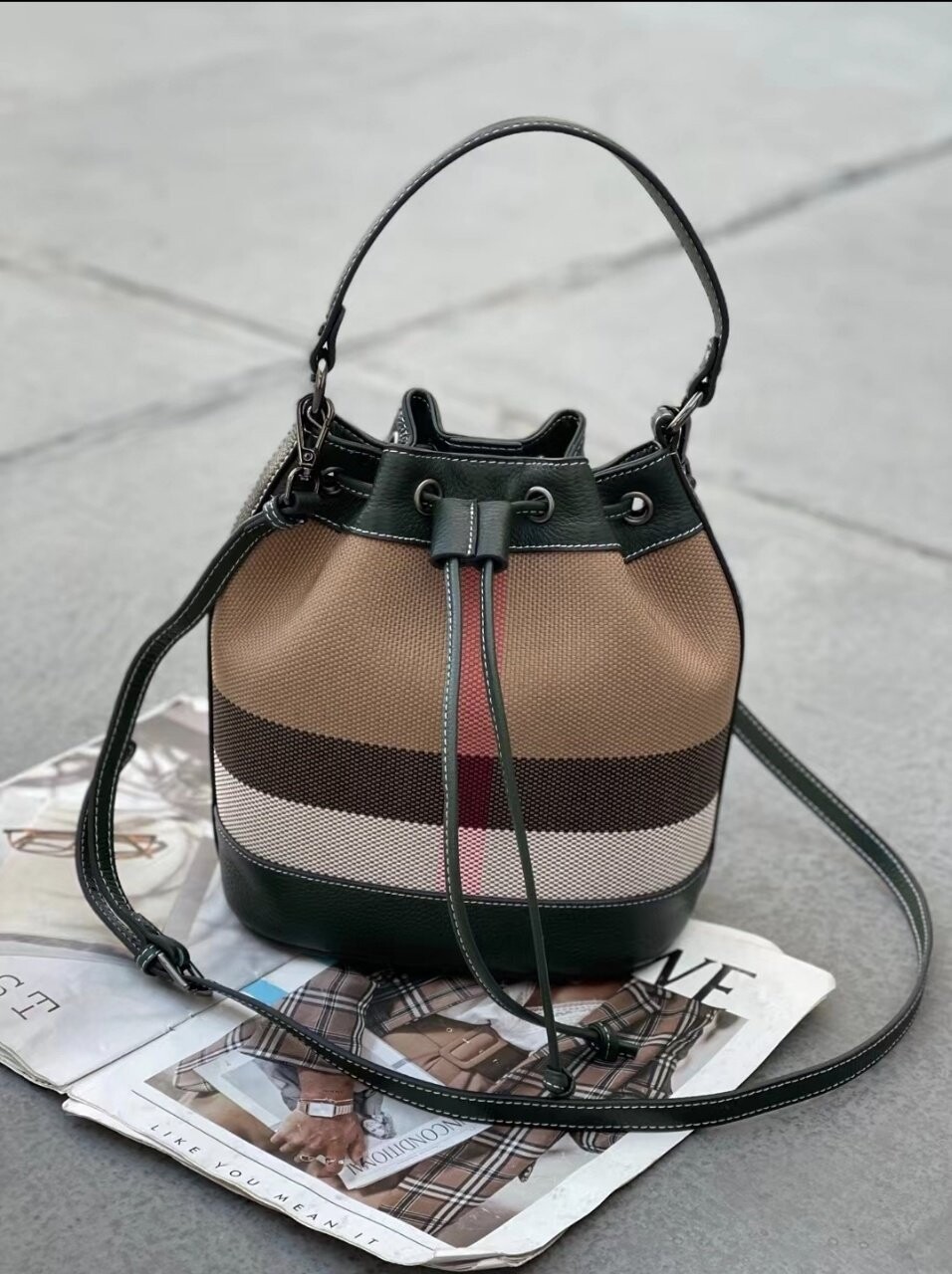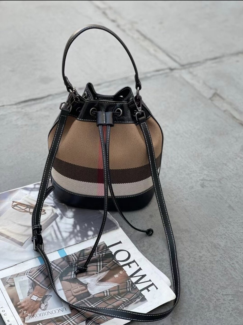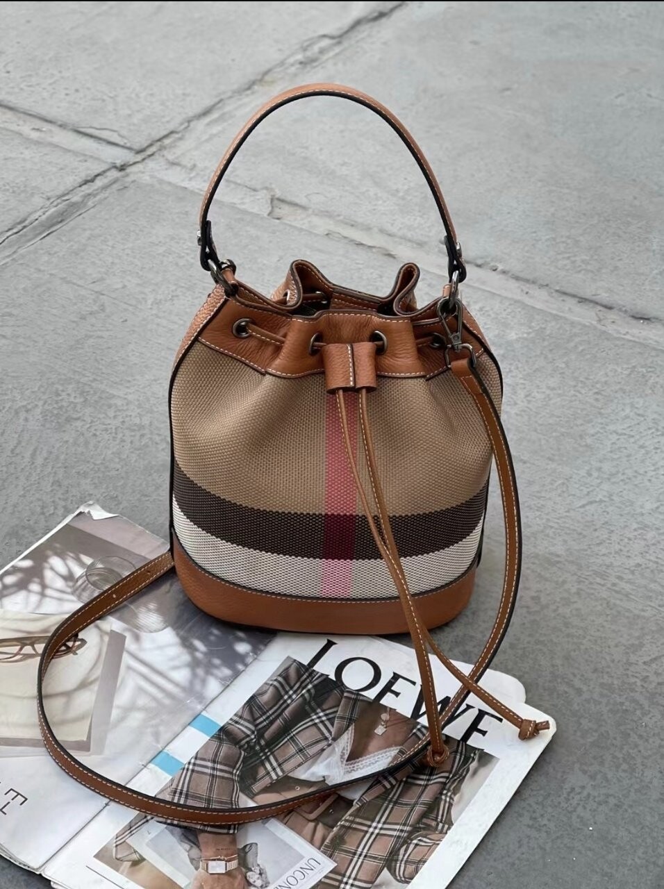 [기획 천연가죽] 체크 버킷 크로스백