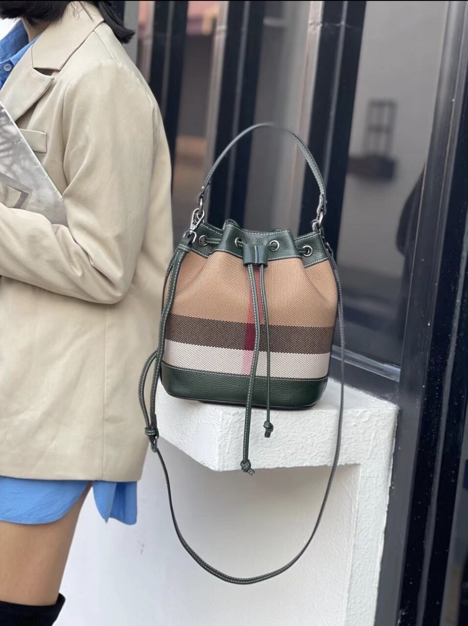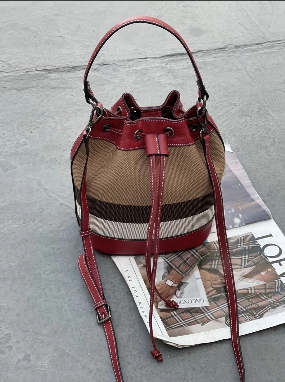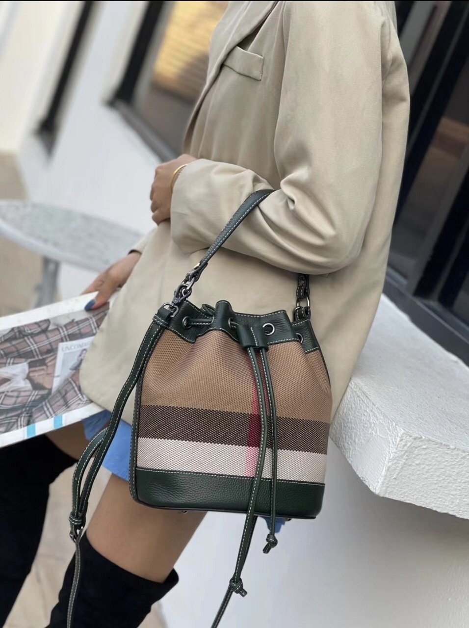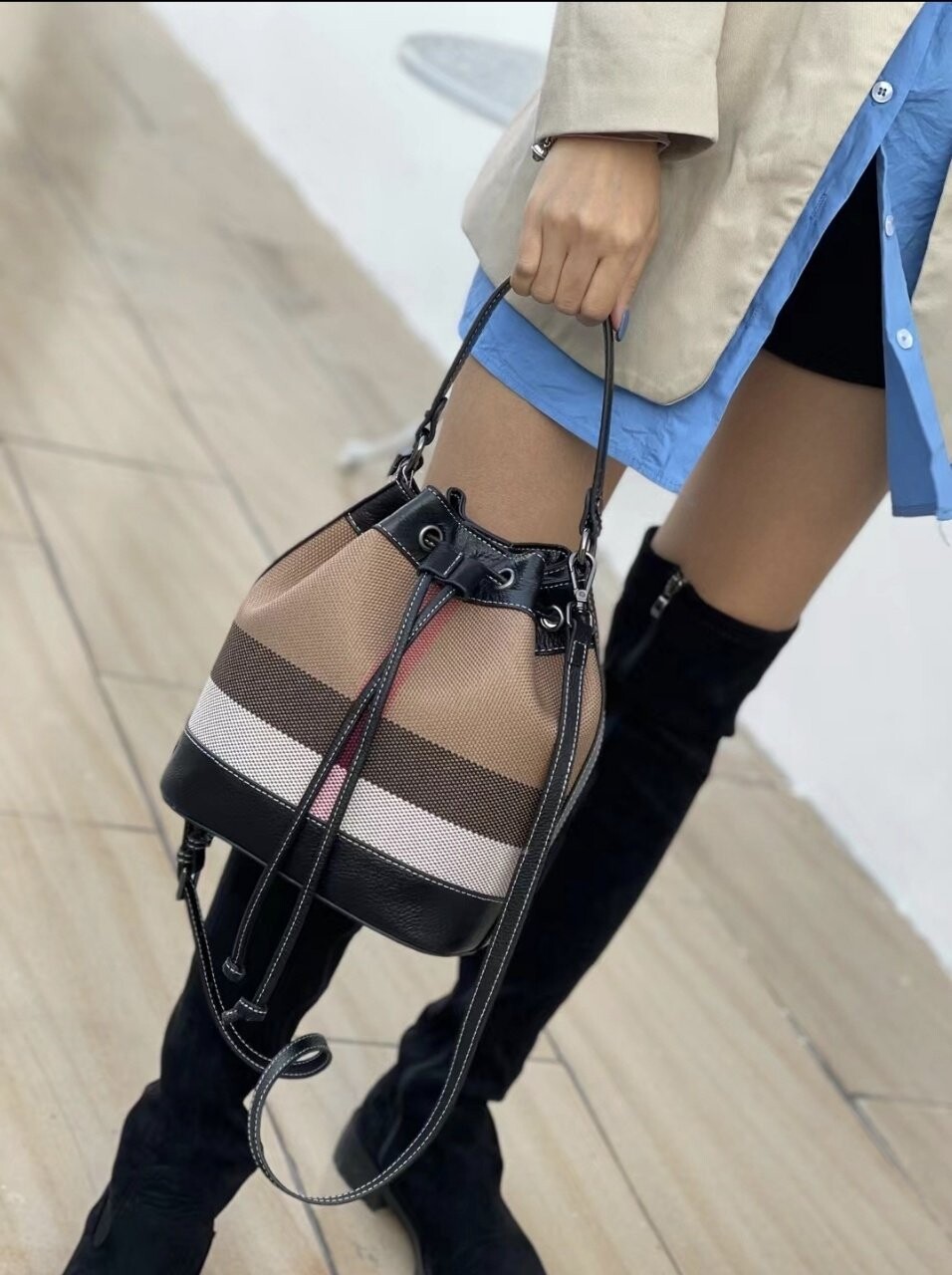 [기획 천연가죽] 체크 버킷 크로스백