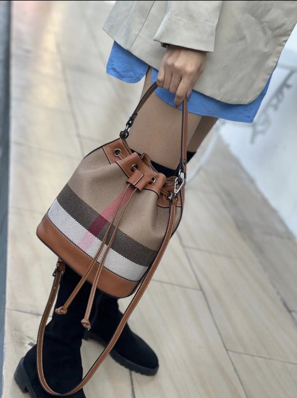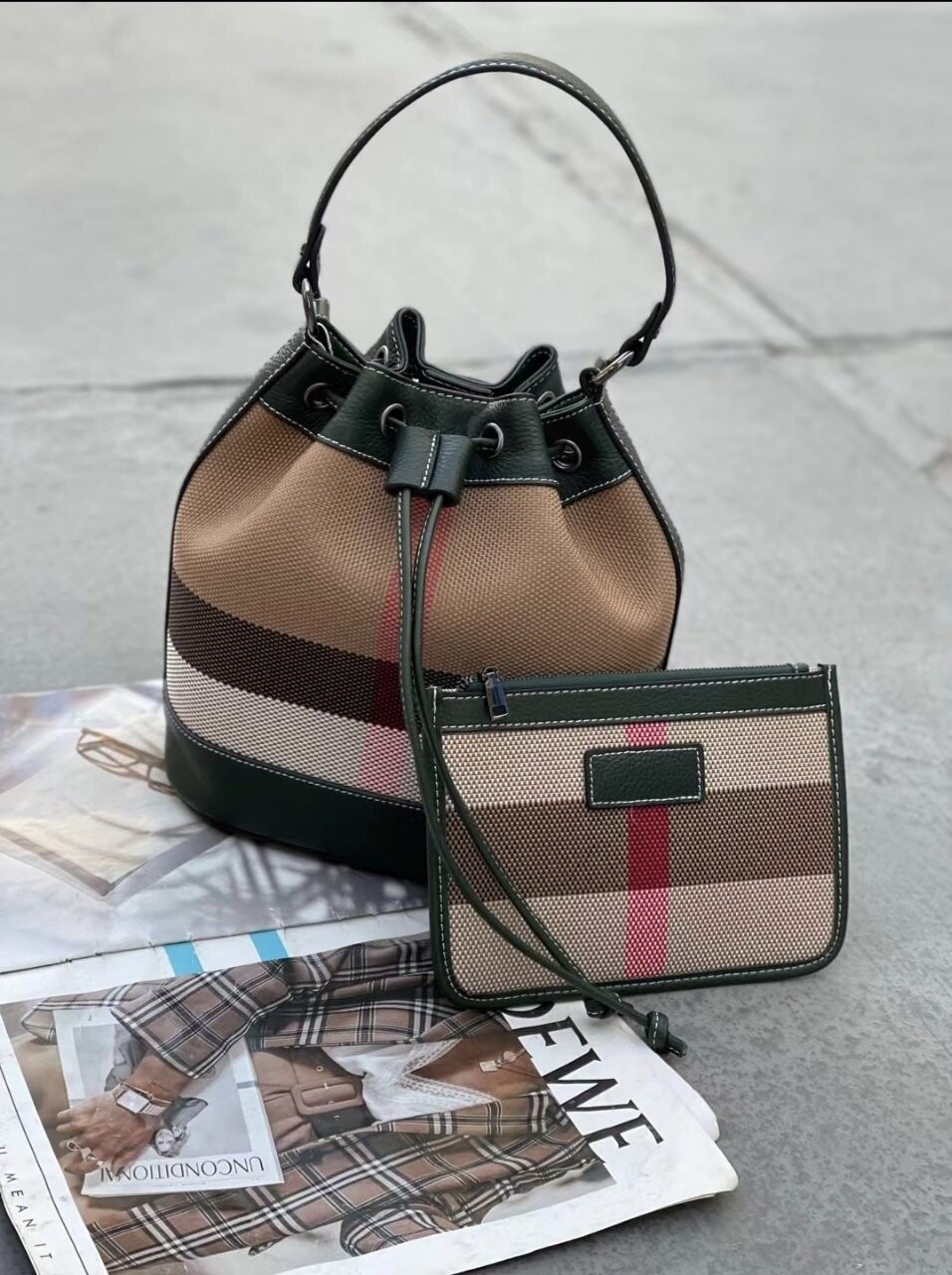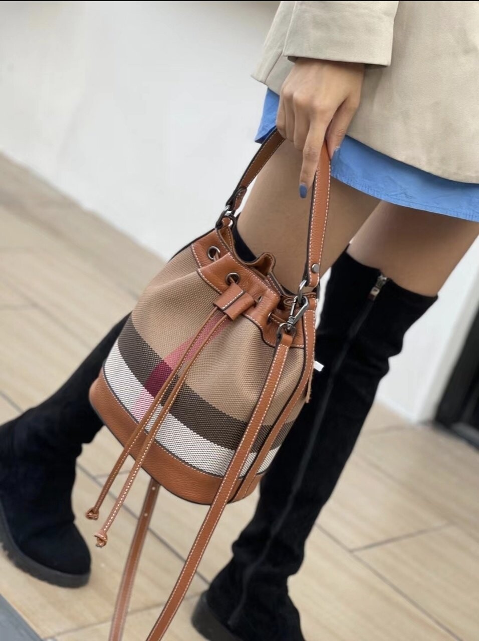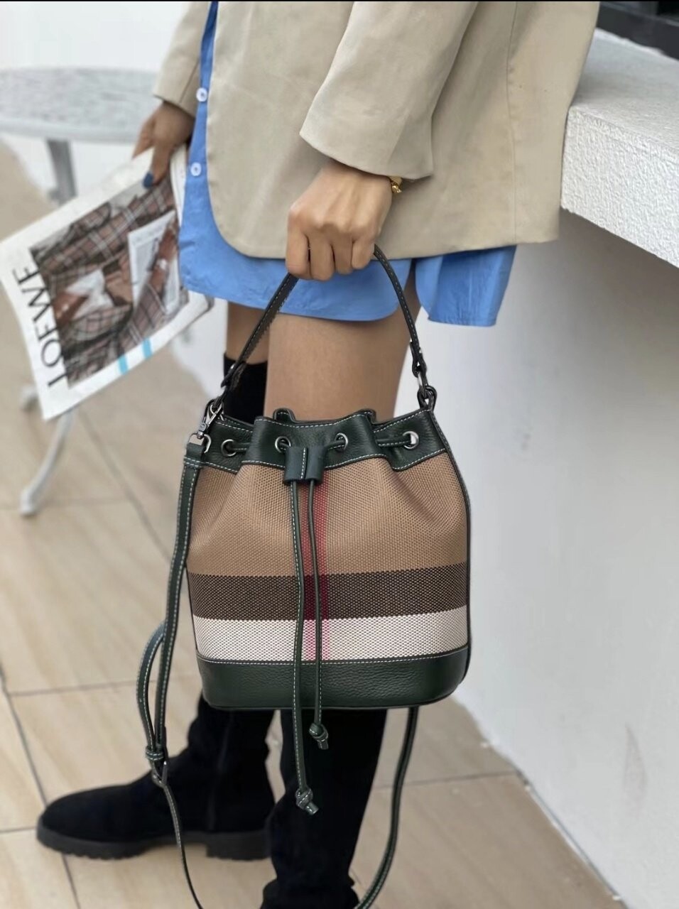 [기획 천연가죽] 체크 버킷 크로스백